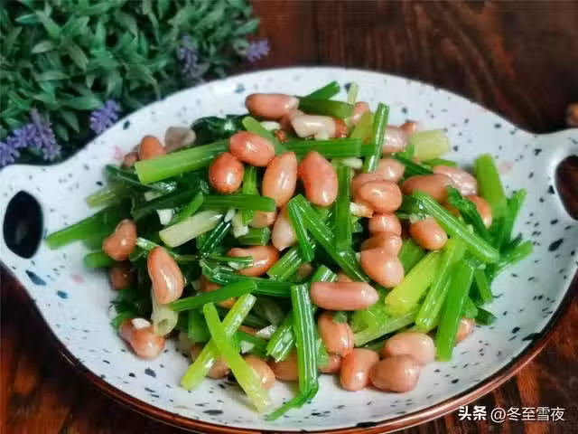 【芹菜拌花生米】所需材料:芹菜半斤、花生米半斤、油鹽適量、香油半湯匙、大蒜3瓣、花椒半湯匙、八角1個、味精少許、