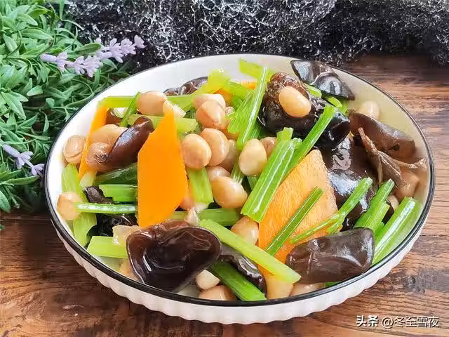 【芹菜木耳拌花生米】所需材料:芹菜半斤、干木耳1把、花生米半碗、胡蘿蔔1段、油鹽適量、大蒜3瓣、花椒半湯匙、八角4個、白糖少許、味精1茶匙、