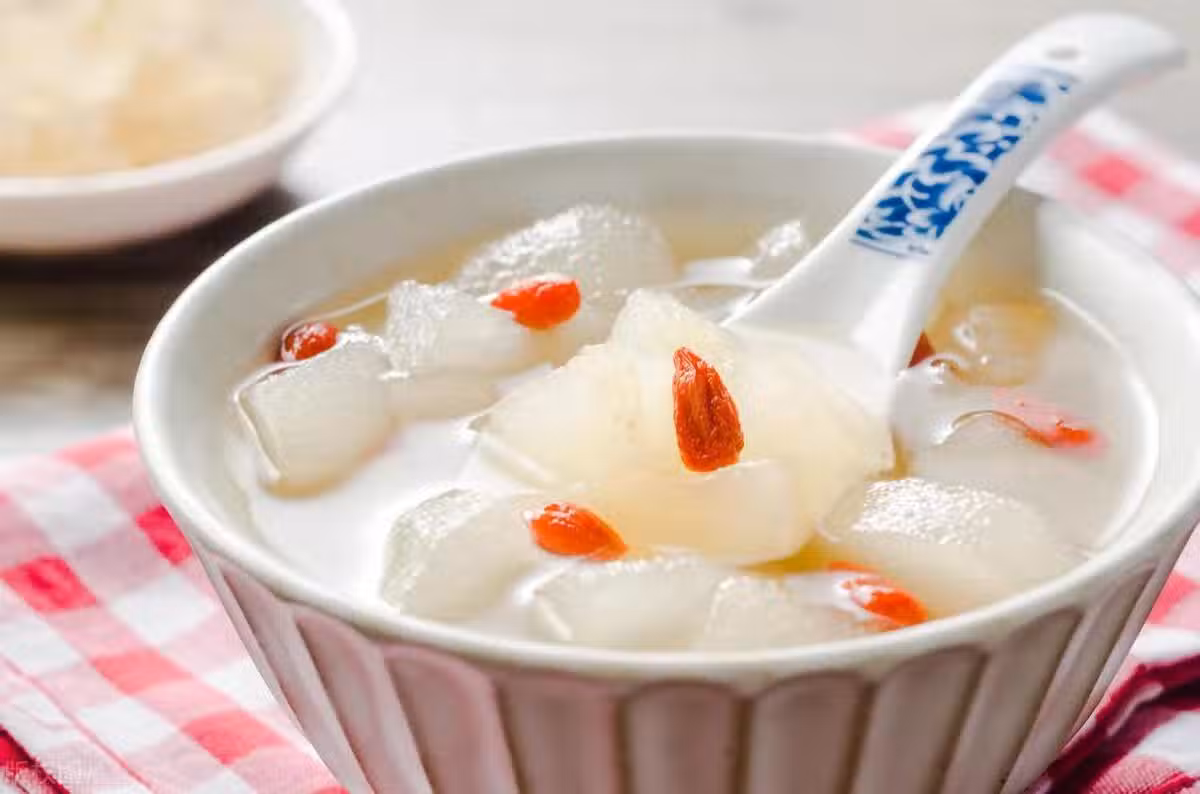 燉煮30分鐘左右,加些冰糖加熱融化,最後加些枸杞,煮2分鐘便可。