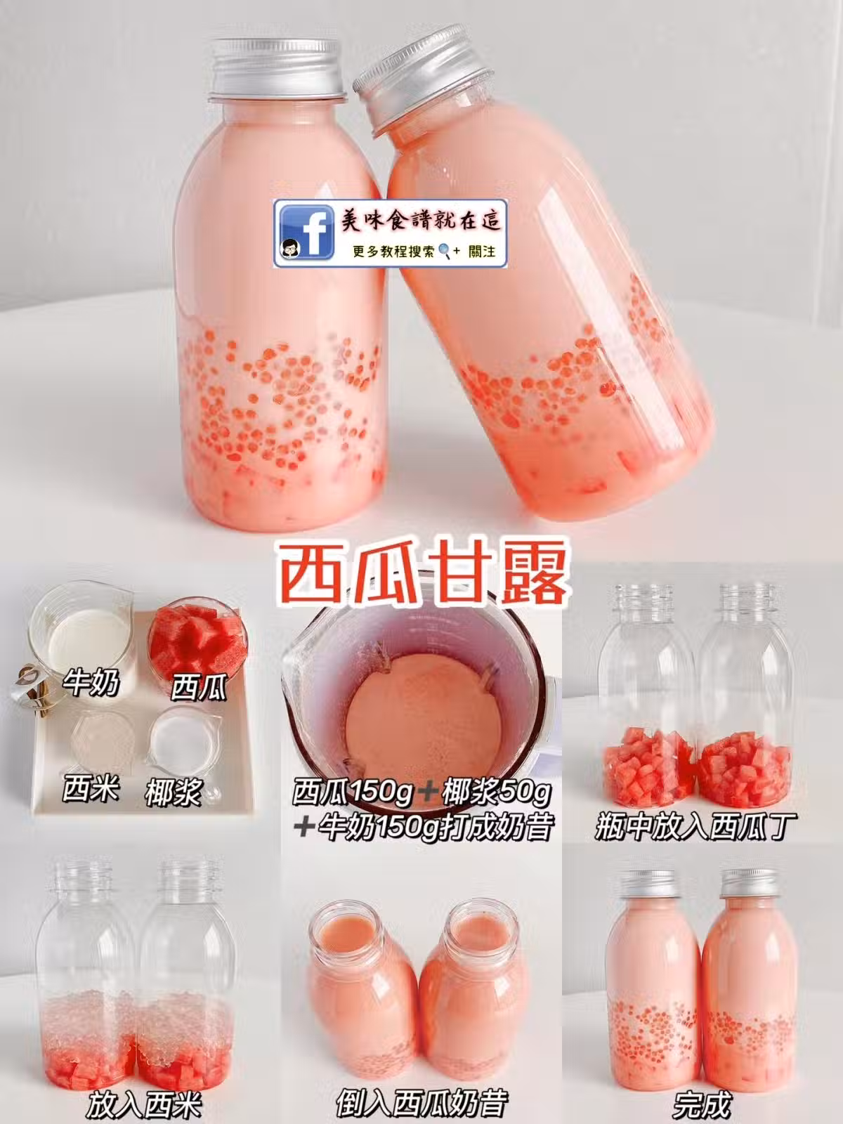 ▪️瓶中依次放入西瓜丁,西米,倒入西瓜奶昔