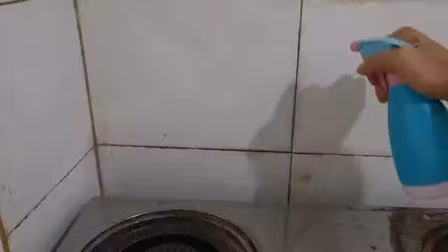 同樣的方法,我們還可以用它來清潔灶台後面,瓷磚上面的油污,也是同樣的方法噴一噴製作好的液體,再次用抹布給它擦拭乾凈,其實每次炒菜的時候,瓷磚上面也會噴濺一些油污。