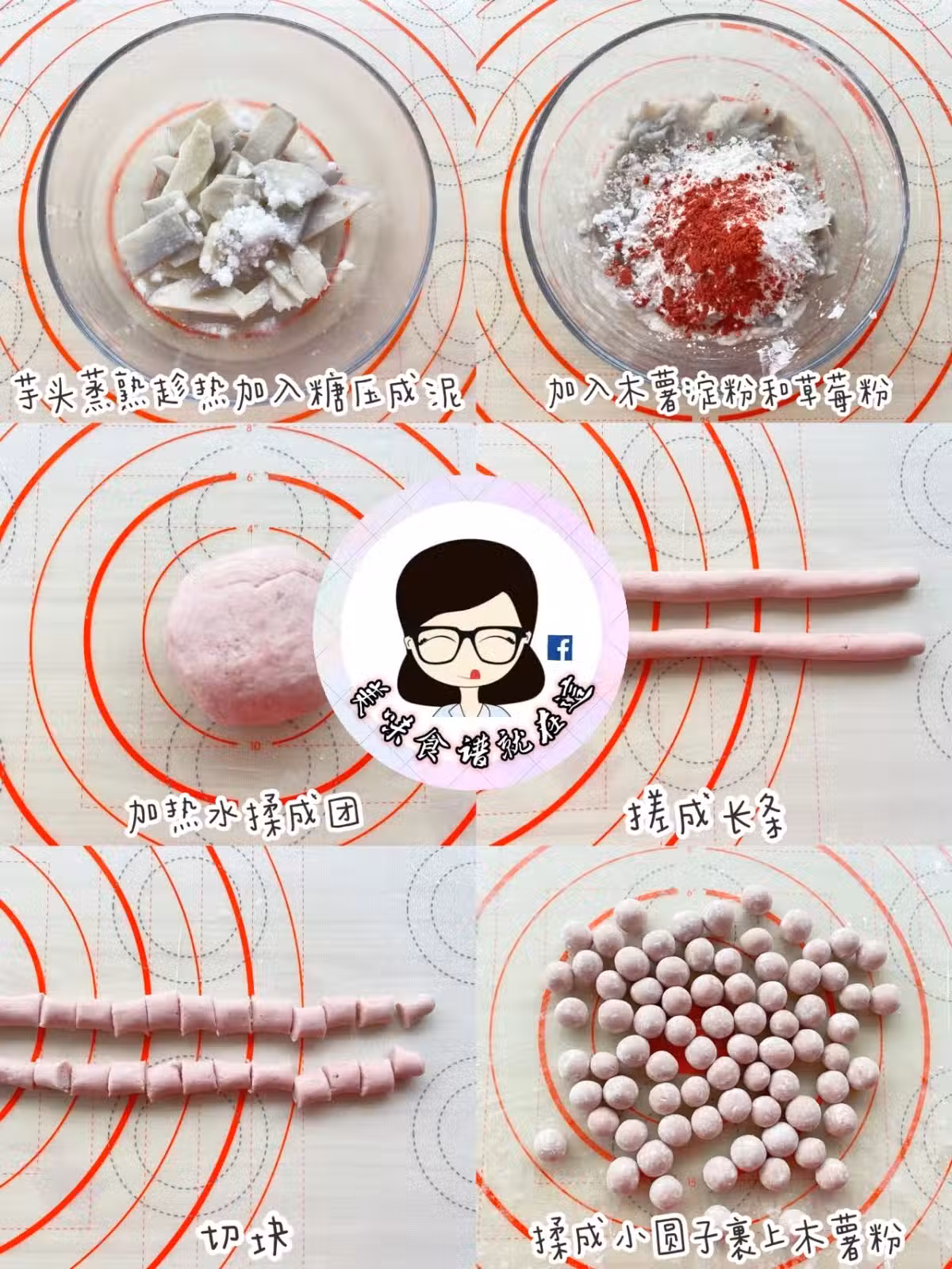 2⃣️抹茶味和草莓味,分別芋頭蒸熟,趁熱加糖壓成泥,加入木薯澱粉和草莓粉,抹茶粉即可,加入開水揉成團,搓成長條切塊揉圓