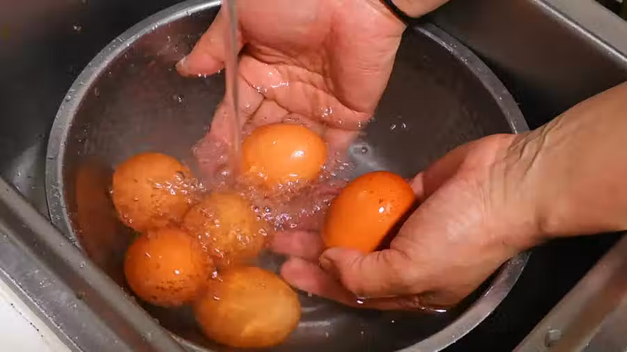 浸泡雞蛋:再取一盆清水,分別加入2勺食鹽和一勺白醋,攪拌均勻後再放入雞蛋浸泡3分鐘。這一步的目的有二:一是利用食鹽的消毒殺菌作用將雞蛋清洗的更乾淨;二是因為雞蛋殼的主要成分是碳酸鈣,加白醋浸泡能夠氧化蛋殼,使蛋殼變軟,就可以防止雞蛋煮的過程中破皮,而且煮好後也更容易去皮。