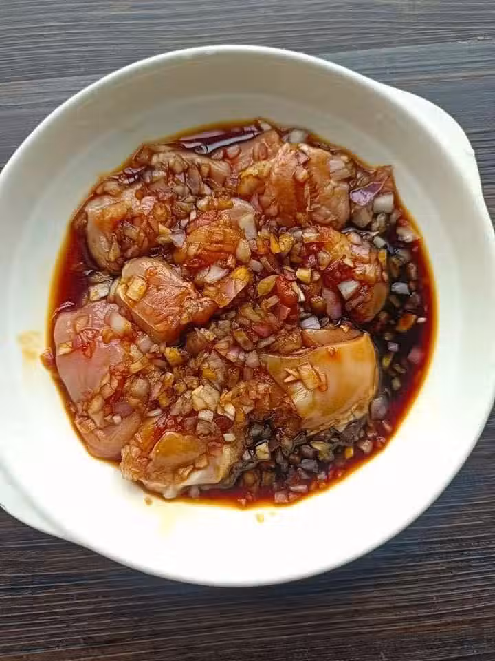 1)雞腿去皮 加入照燒醬 黑胡椒 料酒 鹽和蔥末腌制半小時 香菇泡軟備用