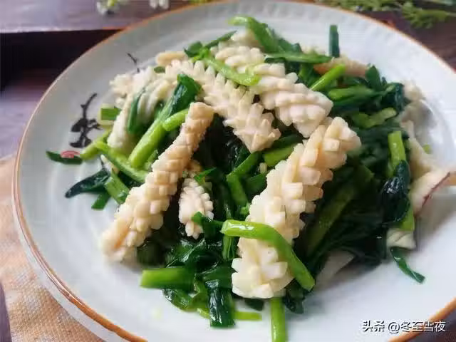 【魷魚炒韭菜】所需材料:魷魚1條、韭菜半斤、油鹽適量、料酒1湯匙、生抽1湯匙、