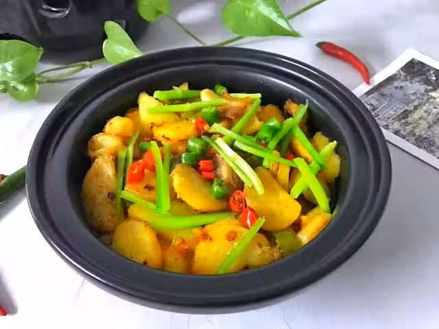 【材料】:土豆3個,洋蔥1個,五花肉100克,青、紅椒適量,大蒜4瓣,鹽適量,油適量,麻辣香鍋調料1勺
