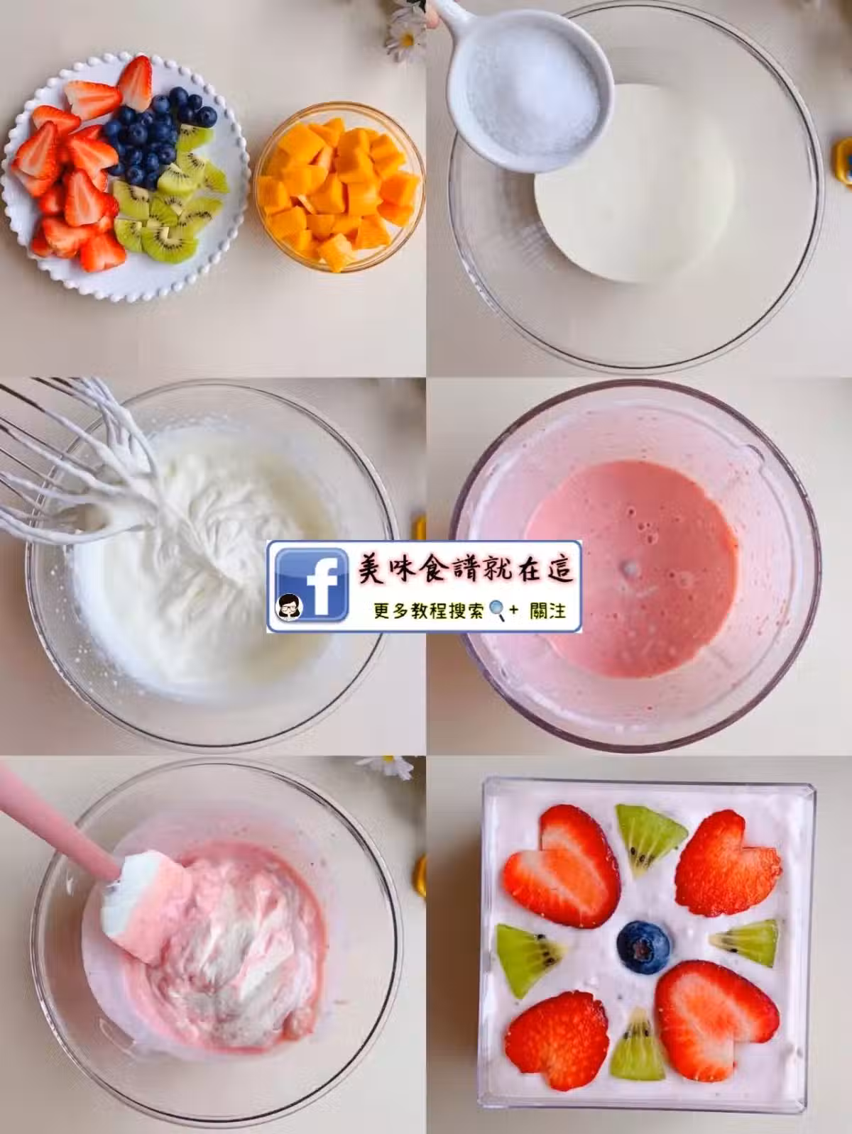 3.)再分別拌入奶油中,裝入裱花袋,擠入模具中,抹平,分別放上草莓藍莓、芒果、獼猴桃蜜紅豆、奧利奧餅乾裝飾,送入冰箱冷凍,凝固後取出脫模切塊即可