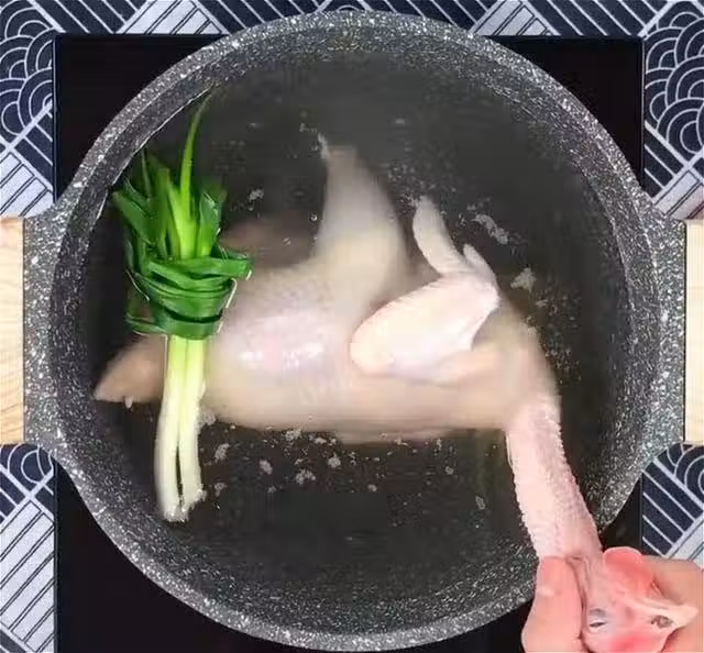 2.鍋中的水熬好後就轉成小火,使水面保持微微的沸騰就可以了,然後手提著雞頭,將雞身浸入熱水中10秒鐘,注意在鍋中要將雞身多晃動幾次,防止雞腹內存入空氣而受熱不均;10秒鐘到後就提出雞身控水20秒鐘,然後再次浸入熱水中浸泡;如此反覆四五次即可。