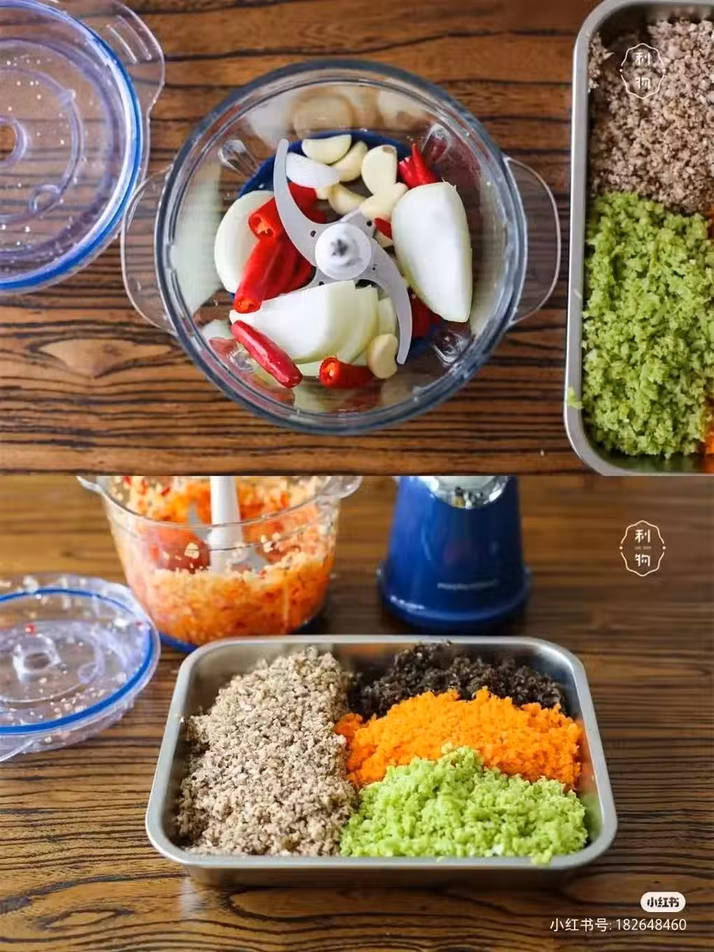 1.】切碎配菜:將香菇、黑木耳、蠶豆、胡蘿蔔分別打碎,再將白洋蔥、大蒜、辣椒一起打碎,備用。