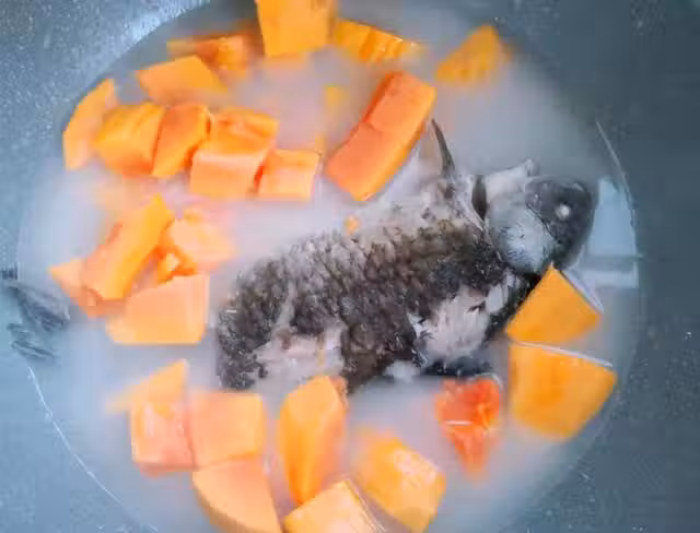 第四步,大火煮十分鐘的時間,這個時候將煎好的鯽魚放入在鍋中,繼續用大火煮一會,過程中鍋面的浮沫記得要用勺子撇乾淨,繼續煮一會;