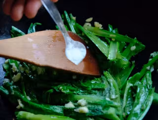 第四步,將事先處理好的油麥菜放入鍋中,轉大火,快炒至油麥菜微微發軟的時候,加上點食鹽調味,翻炒均勻,然後將剩餘的蒜蓉也放入鍋中;