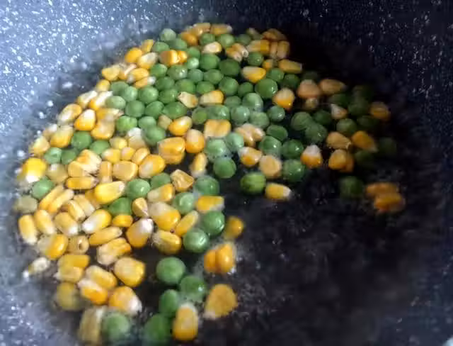第二步,用筷子攪拌均勻後,讓蝦仁腌制一會,新鮮青豆和玉米粒準備出適量,事先要清洗乾淨,在鍋中添上水,將水燒開,放入青豆和玉米粒焯下水;
