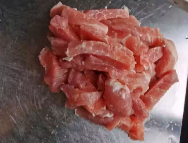 製作過程:第一步,梅花肉,洗凈後,擦乾,將豬肉切成條,按照個人的喜好切,加入料酒、生薑片、食鹽、白糖,再加上一點點辣椒粉;