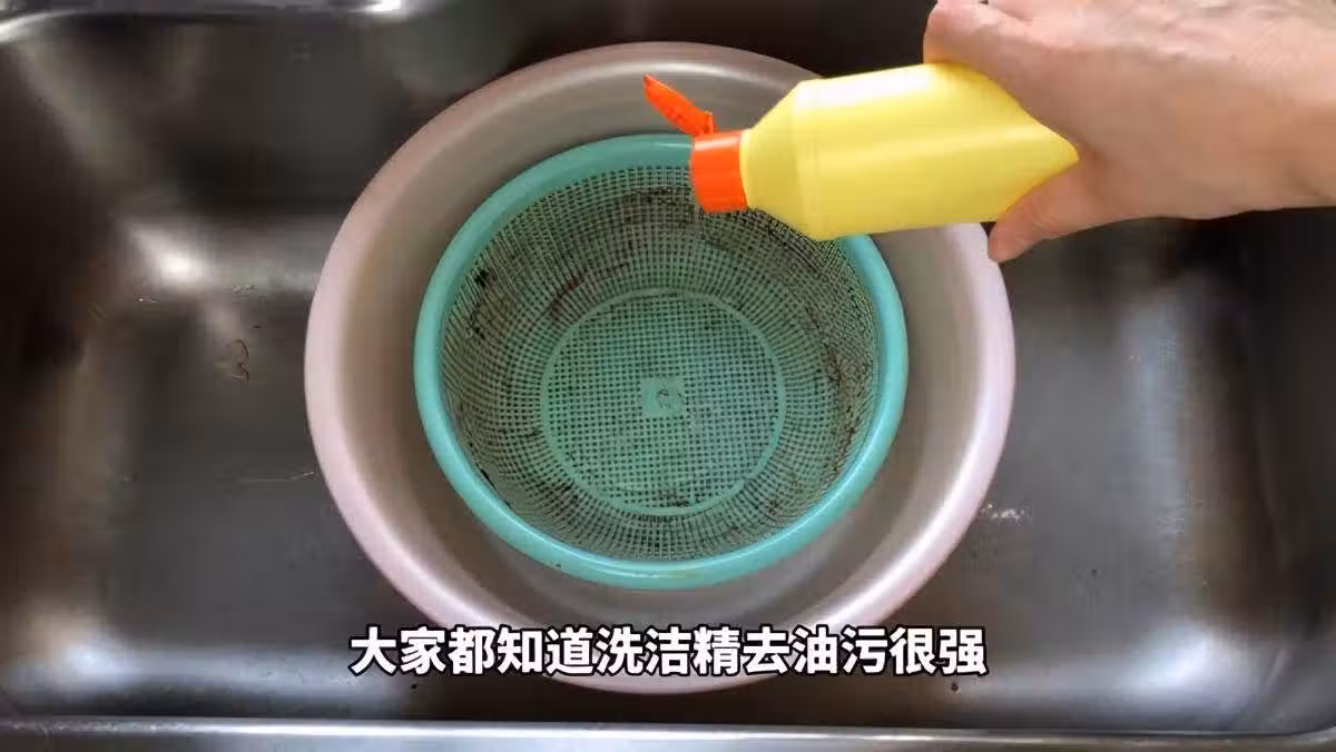 首先,把臟的菜籃子放入一個盆中,然後準備洗潔精擠入盆中,大家都知道洗潔精是我們廚房清潔油污的好幫手,去除油污特別好!