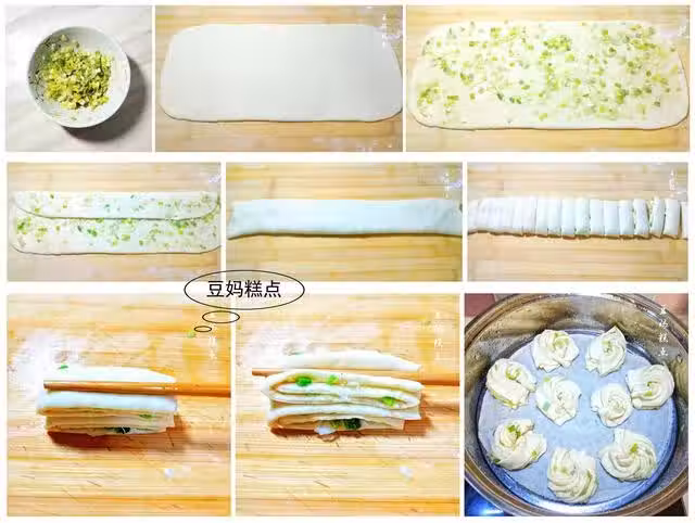 6、三分之一處摺疊起來,摺疊處也一樣抹些蔥花;
