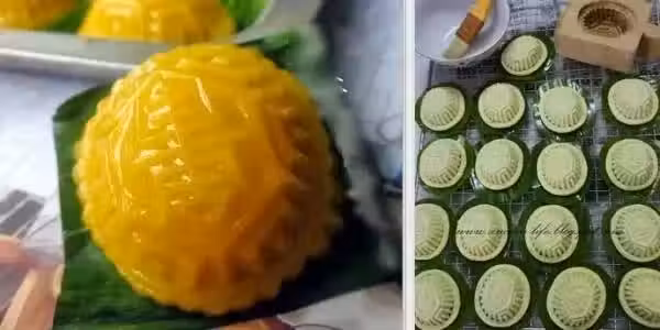 3)把面團平均分割。搓成圓形,壓扁後包入芋泥餡後再搓圓放入塗上少許糯米粉的模型里印出形狀。把糕放在一小片塗上少許油的香蕉葉上。