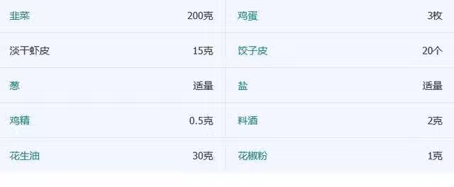 【配料】韭菜,雞蛋,蝦皮,餃子皮,蔥,食鹽,雞精,料酒,花生油,花椒粉