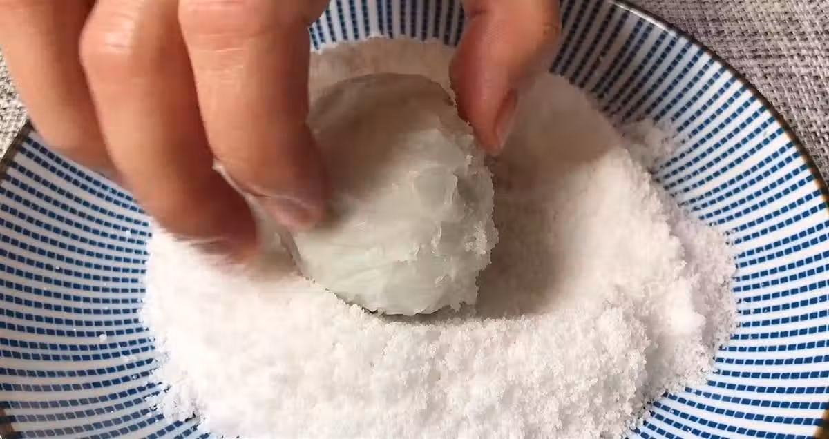 8、鴨蛋完全沾上白酒之後,再次放進食用鹽裡面,再次沾上食用鹽,這次也是要完全沾上食用鹽,然後準備一張 保鮮膜或者是保鮮袋,將沾滿食用鹽的鴨蛋完全包裹起來。按照上面的方法依次將所有的鴨蛋都給包裹好。