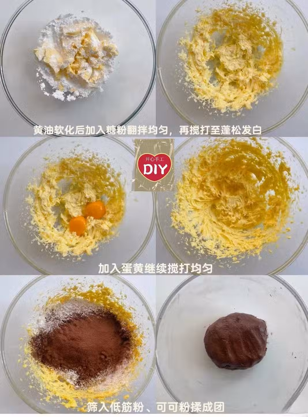 2)加入蛋黃繼續攪打均勻,篩入低筋粉、可可