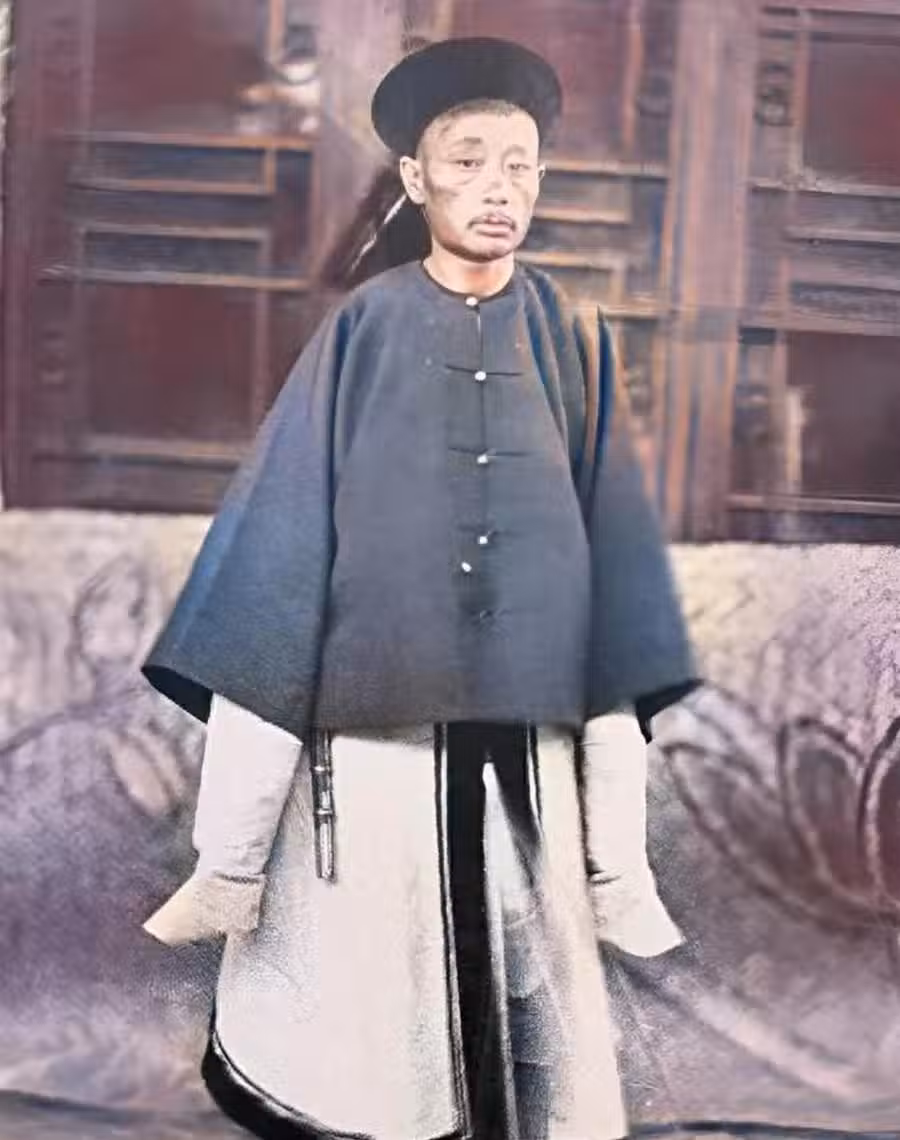 照片中的男子衣不蔽體,身上只披了一塊破爛的草蓆。