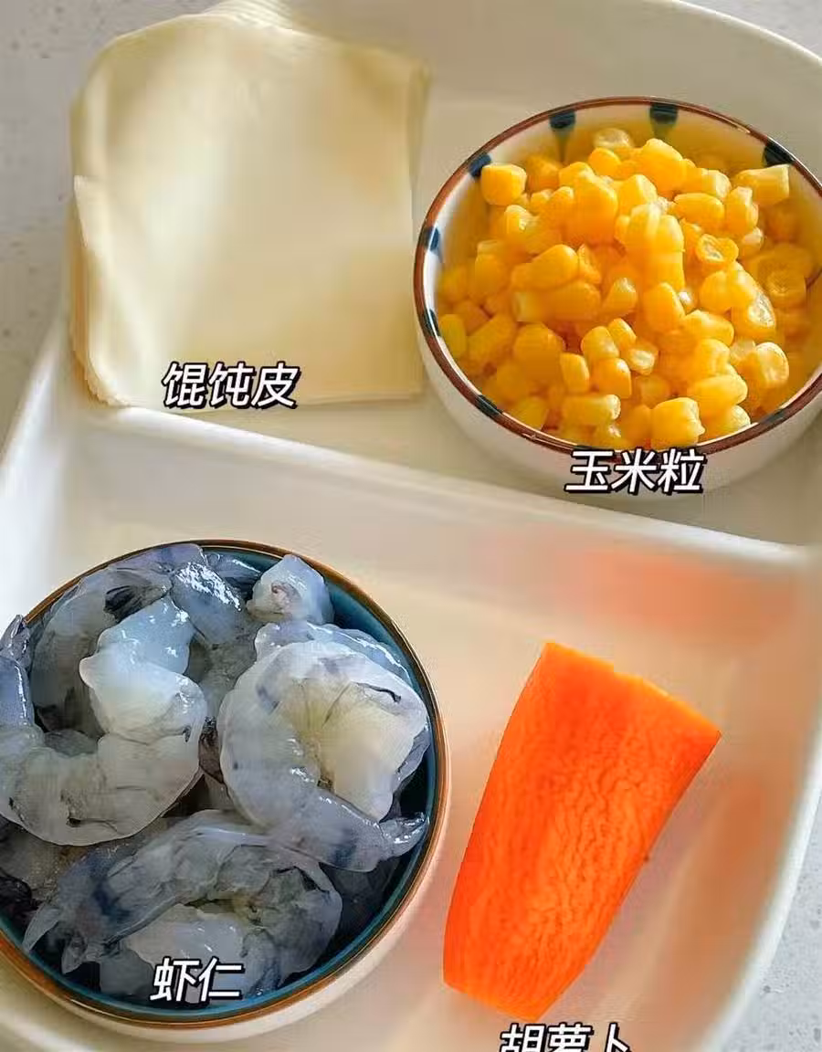 準備食材:餛飩皮,玉米粒,蝦仁,紅蘿卜。