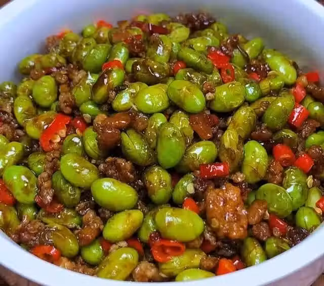 3.起鍋燒油,放入蔥蒜末炒香,倒入肉末炒至變色,淋上調好的料汁煮至濃稠盛出備用,另起鍋熱油倒入毛豆翻炒一分鐘,倒入炒好的肉末,再加點小米椒翻炒入味出鍋裝盤。