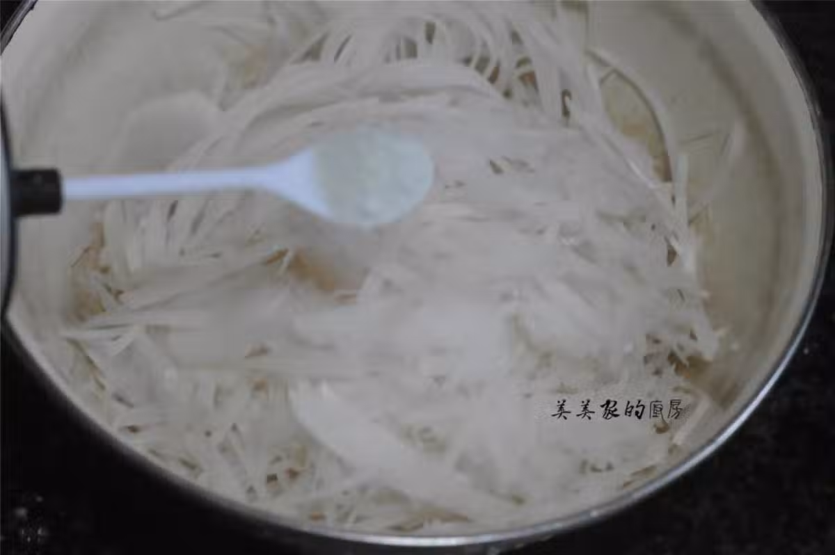 蘿卜洗凈擦絲,撒入適量的鹽拌勻,腌制十分鐘左右,剎水。