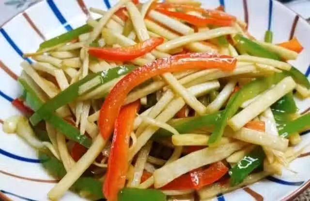 1.把茭白、紅椒、青椒洗凈後切成絲。