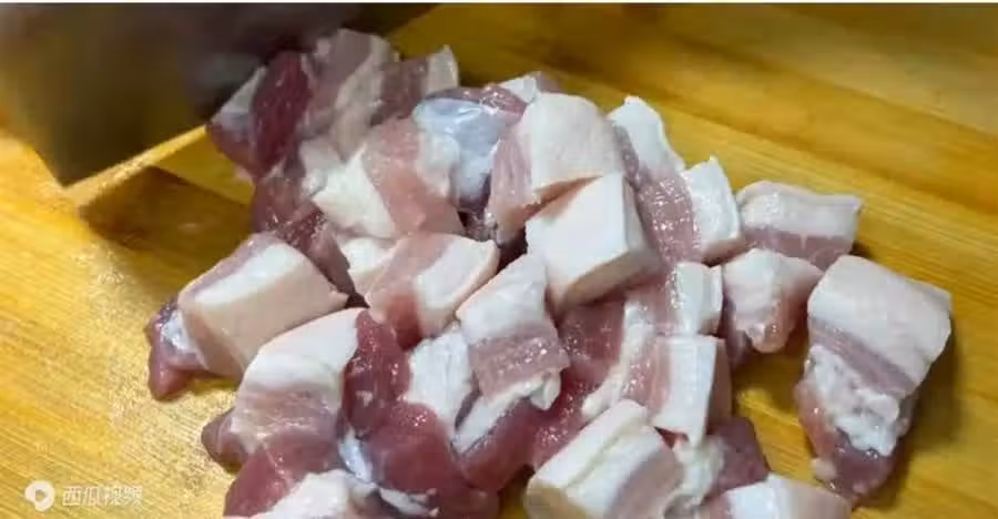洗好的五花肉放到菜板上,切成兩指寬的厚塊,選五花肉的時候一定要選擇這種肥瘦相間的,這樣的五花肉做出來的紅燒肉才香,才好吃。