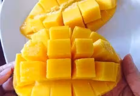 第四步:將芒果垂直切成兩半,然後用刀將芒果肉切成小塊。將牛奶和準備好的椰奶倒入榨汁機中,加入少許煉乳和芒果漿。 、充分混合;