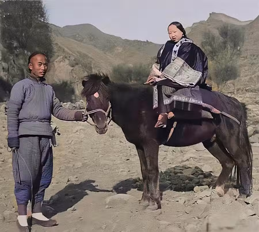 一名山西的地主婆正坐在一匹馬上,而家中的長工正站在馬頭前牽著馬的韁繩。由於地主婆裹著小腳,走不了遠路,於是在有事要去稍遠一些地方的時候,就會選擇騎著馬去。
