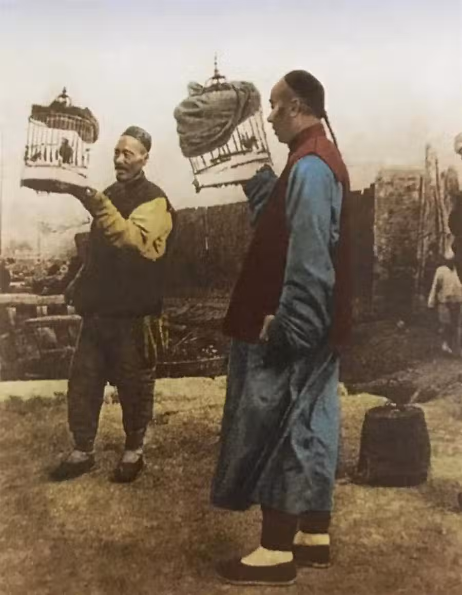 在京城的一條大街上,兩名八旗子弟正架著鳥籠子在逗弄著裡面的鳥,晚清時期的八旗子弟每日游手好閑,無所事事,除了吃喝玩樂,基本上沒有別的事情可做。