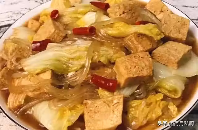 2、鍋中放入油,油熱放入蔥姜蒜干辣椒爆香,放一勺十三香炒出香味後再放切好的白菜翻炒幾下,加水沒過白菜,再加生抽兩勺、蚝油一勺、老抽一勺、鹽適量,放入泡好的粉條,凍豆腐,小火燉白菜至軟,翻炒均勻即可出鍋。
