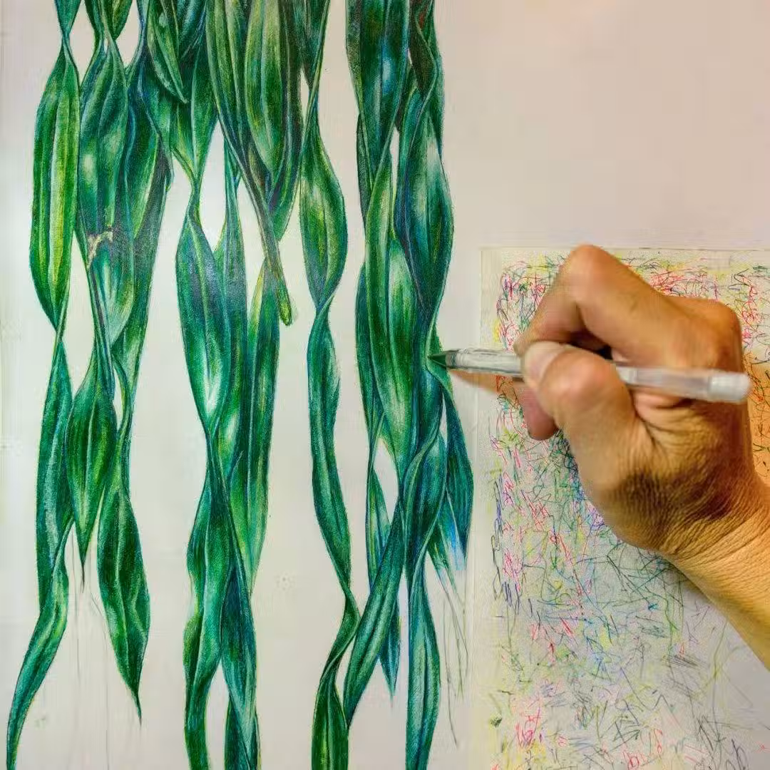 這段「高齡讀書」的經歷讓阿介發展出了另外一個技能。因為上課的時候,同學們非常吵鬧,被吵得受不了的時候,他開始畫植物描圖,這樣就能夠平靜下來。