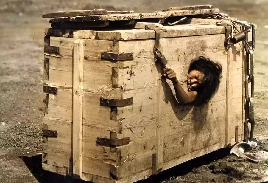 這是清朝時期,蒙古草原盛行的一種殘酷的刑罰——餓刑。罪犯被赤身關進箱子裡,沒有水和食物,長久的風吹日曬,箱子裡的人只能自生自滅。