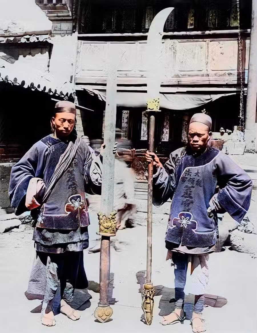 清朝時期,在雲南昆明的一座寺廟的大殿前,有兩名男子分別手持大寶劍和大刀,眼中透著一股殺氣。他們的衣服上寫著「大法總領事」等字樣。是不是感覺有點奇怪?