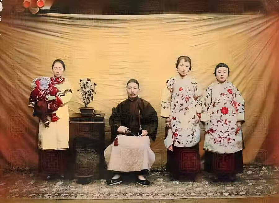 清朝時期,一名中年男子與自己妻妾的合影照。照片中,男子風流倜儻,妻妾貌美如花。一時間,真是難以清哪是正妻,哪才是小妾。
