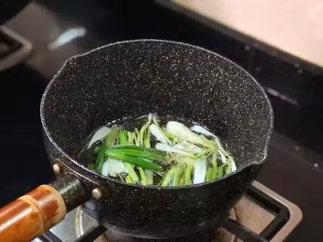 起鍋燒油,如果有豬油更好,沒有就用花生油,油熱後,將香蔥段下鍋,中小火慢熬,熬煮至蔥段變成墨綠色。然後將蔥段撈起來關火,趁油溫還熱,加入2勺生抽、1勺老抽、1勺蚝油,1勺白砂糖,攪拌充分混合。這樣熬煮出來的蔥頭油非常的香。(因為老抽和生抽本身都很咸,所以就不用再加鹽了,以免太咸了,如果想要顏色濃郁一點,可以多加1勺老抽哦,這樣涼拌出來的面更加油量有食慾)