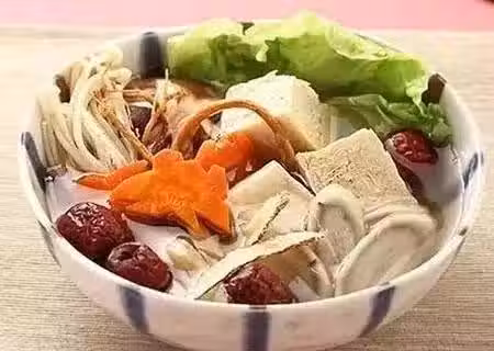 2、取一湯鍋放入800cc水煮滾,放入作法1的所有材料煮滾,續放入藥材,加蓋以小火燜煮5-6分鐘,加入調味料拌勻即可。