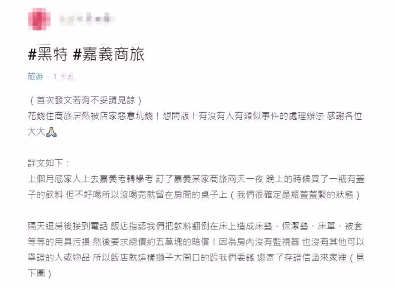 全家到嘉義玩!留飲料退房隔天「被飯店討清潔費5萬」:想坑我們錢 業者調監視器愣住「你們明明有回來」