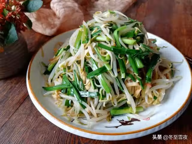 材料:綠豆芽250克、干豆腐3張、韭菜1把、油鹽適量、姜2片、蒜2瓣 、米醋少許