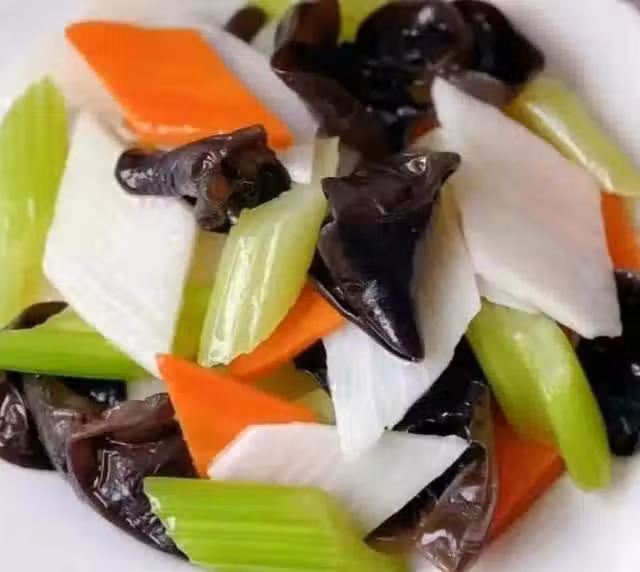 1.山藥、胡蘿蔔洗凈去皮切菱形片。西芹洗凈去掉葉子斜切成段,木耳泡發去蒂撕成小朵。