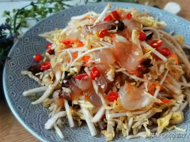 【白菜拌海蜇頭】所需材料:腌漬海蜇頭1斤、白菜心1個、胡蘿蔔1段、鹽適量、蔥1段、大蒜3-4瓣、海鮮醬油2湯匙、老陳醋3湯匙、白糖1湯匙、料酒半湯匙、
