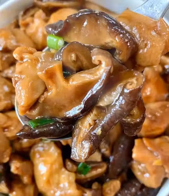 步驟二:鮮香菇洗凈去蒂切薄片,鋪一層在碗底,倒入腌制好的雞腿肉,腌雞腿的料汁也倒進去,不加水。水開上鍋蒸20分鐘,出鍋撒蔥花即可。