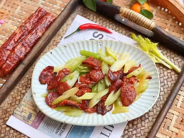 做好的臘腸風味鮮美,醇厚濃郁,越嚼越香,不愧是中華傳統的特色美食之一。臘腸的做法很豐富,可以做成廣式煲仔飯,或是上鍋蒸一蒸,也是別具美味,經常看到北方朋友用臘腸燉湯,那湯汁也是格外香醇好喝;今天我就用臘腸今天炒一道家常菜,芹菜炒臘腸,葷素搭配,營養豐富又美味,百吃不厭。