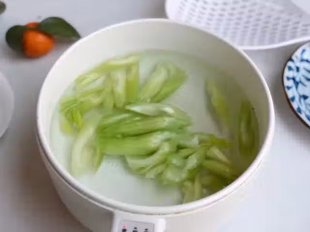 同時焯燙完,再下鍋炒,可以縮短芹菜烹飪的時間,使芹菜保持清脆口感和翠綠色澤。芹菜焯燙完,要立刻沖一下涼水降溫。