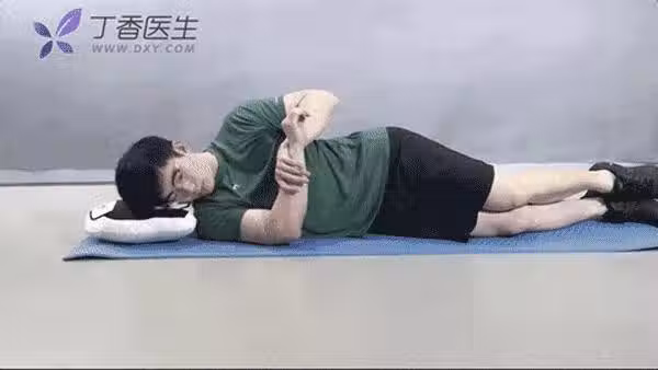 側躺下,用自由的手按壓另一手臂,直到被按那一側肩部有緊張感。