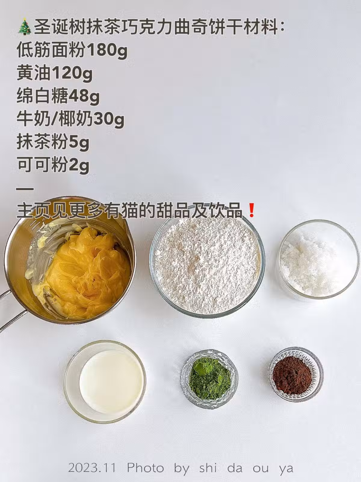3️⃣將麵糰分成一大一小兩份,分別加入抹茶粉和可可粉,調色揉勻。 4️⃣放入裱花袋,擠出聖誕樹形狀後冷藏30分鐘。