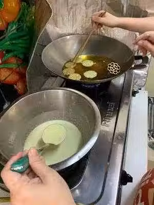 3、模具燒熱後沾上粉漿,轉為中火炸不可以沾過模具,放入鍋內時不可放入鍋底,等差不多15秒就會自動脫離模具。