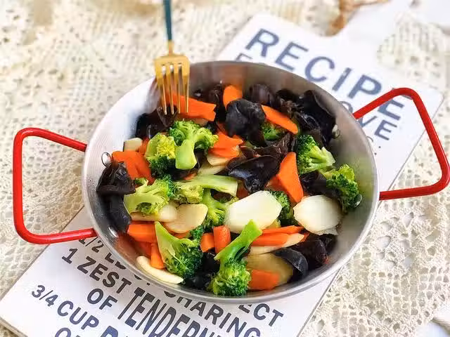 1、將西蘭花切成小塊,放入淘米水中浸泡一下;木耳要提前泡發好,但是泡發時間不要超過4個小時,要不然會滋生細菌,影響身體健康。山藥和胡蘿蔔削皮切成菱形薄片。